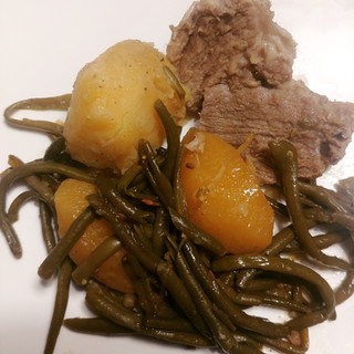 Pendant ce temps là, cuire à la vapeur douce, les haricots verts qui seront servis généreusement (la moitié de l'assiette) en accompagnement de ce plat roboratif traditionnel.